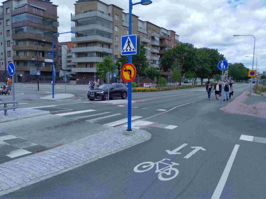 Den nya dubbelriktade GC-banan längs med Sleven Säfwenbergs väg är likt många andra i Uppsala: inte dålig, men inte speciellt bra heller. Men när jag väl hade kommit över Tullgarnsbron blev jag verkligen förbryllad: plötsligt slutar cykelbanan tvärt och går över till gångbana. Här behövde jag bromsa hårt för att förstå hur det var tänkt här: jag behövde korsa bilvägen och fortsätta på andra sidan. Det fanns ingen som helst hänvisning om det, och skylten med förbud mot vänstersväng bara bidrog till förvirringen. Så här ska en nybyggd huvudcykelväg anno 2025 inte se ut!